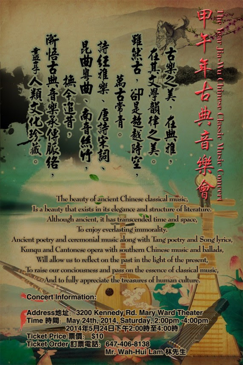 2014甲午年的亚裔文化月,多伦多雅乐艺术中心、耆乐社和雅乐合唱团的艺术家们将于5月24日下午2:00在士嘉堡为多伦多各族裔社区献演中国传统文化艺术,让社区了解更多中国传统哲学、文学、艺术形式。此次公开演出内容包括雅乐、经典江南丝竹、潮州音乐、广东音乐等,演奏包括古琴、洞箫、笛、阮、琵琶、古筝、二胡、笙及锣鼓打击乐等多种中国传统乐器,整台音乐会将向观众展现中国音乐、文学艺术的经典。音乐会同时还将向观众系统介绍中国传统各类乐器知识。欢迎大家参与!