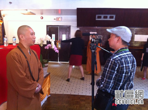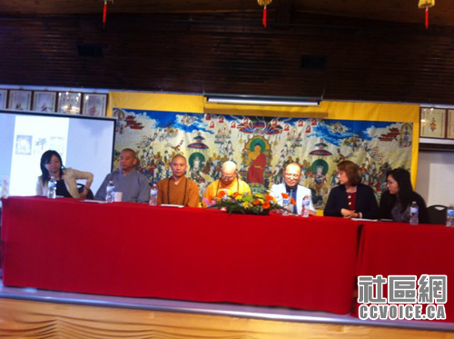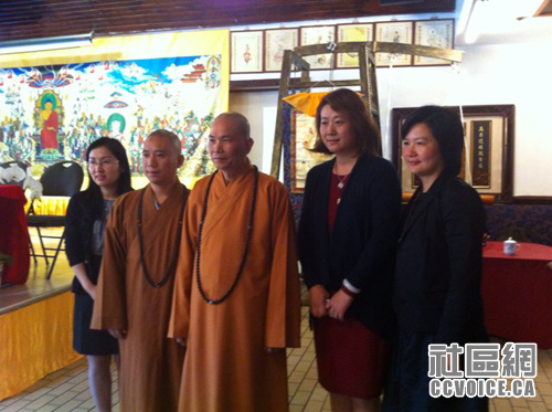 由加拿大智悲利众研修中心(Canada Wisdom Compassion Centre)主办的“第二屆智悲文化艺术展”5月20日上午在加拿大灵岩山中华寺举行新闻发布会。该寺主持释照续法师和正觉寺主持释悟德大和尚介绍了佛家文化艺术与弘扬佛法的紧密关系。加拿大智悲利众研修中心总裁Linda Y Wang详细介绍了智悲佛教文化艺术展的缘起以及即将展出的稀有展品。瑞邦金融董事长李洪先生和显密文教基金会总裁Jasmin Lea Wang纷纷发言宣讲佛陀对于大众的慈悲,如何利益大众,身同感受佛法带来的身心欢喜。