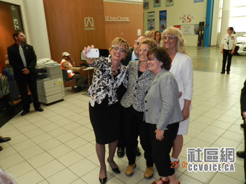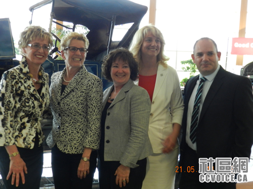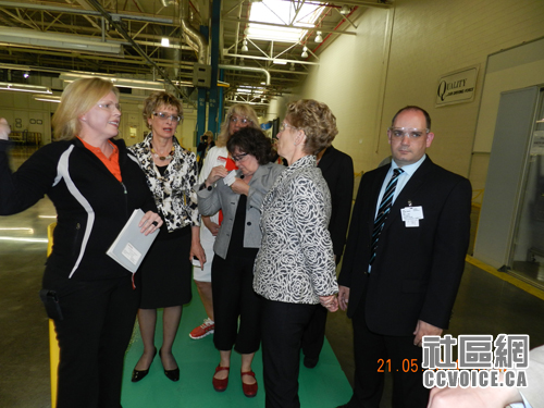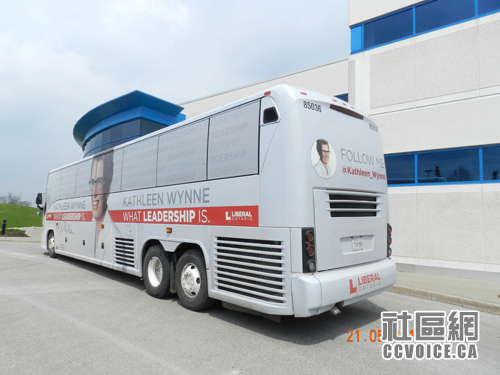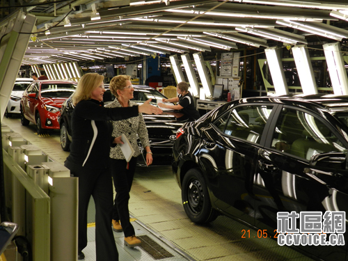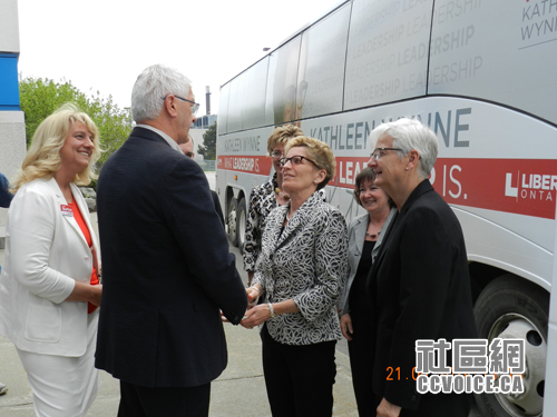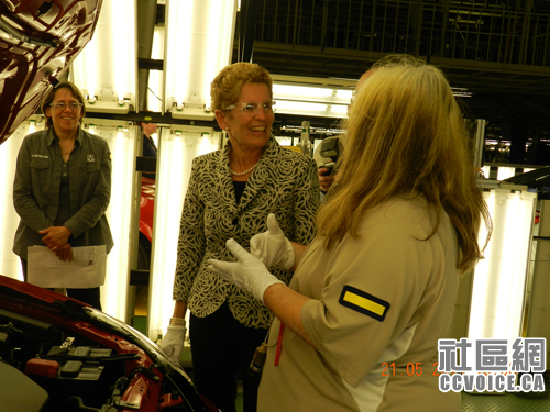 5月21日下午,Kathleen Wynne竞选团队两辆豪华大巴一起驶入位于剑桥(Cambridge)的Toyata生产厂竞选。首先,该厂负责人热情接待了Kathleen Wynne一行,双方在媒体不在场的情况下进行一些会谈。接下来,Kathleen Wynne在工厂负责人的带领下,在工厂间进行了参观。Kathleen Wynne不只听负责人介绍,还特地与生产线操作工交谈,并尝试自己操作,允许媒体拍照。之后,他们一行再次返回不公开场合,继续洽谈。