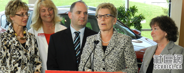在媒体焦急等待中,Kathleen Wynne总算来到媒体发布会现场,会和本地区的四位自由党候选人,开始讲话。Kathleen Wynne强调省府与Toyota的合作关系,比方说,在2013年Toyota投资一亿,在剑桥增加生产Lexus混合动力车,为此省府相应提供了1690万的支持。Kathleen Wynne强调政府代表大众,理应支持不同行业的顶级企业,如汽车工业的5大生产商,确保安省能保持一批高技术、高薪水的工作职位。对于花钱买工作职位的政策,这是保守党Tim Hudak一直反对与申讨的。相反,保守党觉得应该在减少开支上多花力气,来控制财政赤字,也就是一大批公职人员(Public workers)必须下岗。