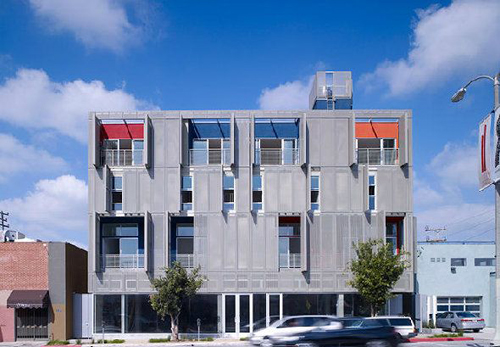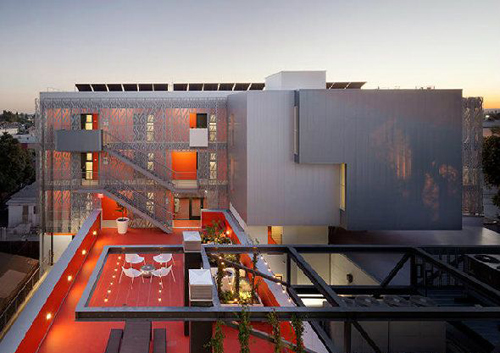 这栋位于洛杉矶的公寓大楼拥有可调整的屏幕立面系统,便于住户随意开关。该大楼的能源效率比美国最严格的能源规范(即加州第24条)还高40%。