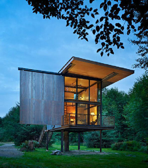 一位嗜好飞蝇钓鱼的客户想要一间简洁、易维护和坚不可摧的小木屋。这间小木屋面积350平方英尺,大部分由预制材料制成,大大降低了建造现场的浪费。支架保护建筑免受洪水灾害。