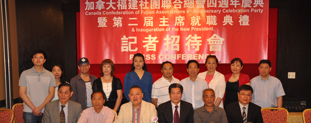 加拿大福建社团联合总会(Canada Confederationof Fujian Associations,以下简称CCFA)6月18日在鸿福酒家召开新闻发佈会。欧阳元森主席宣布加拿大福建社团联合总会将于 7月11日(星期五)晚上六点半于钓鱼台国宴举办四周年庆典暨第二届理事会就职典礼。联合总会主席欧阳元森,理事长魏成义,副主席余乃昌、郭玉明、刘用铿、Eaton Chen,秘书长陈汉君,名誉顾问苗延建及部分分会负责人出席。