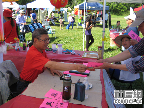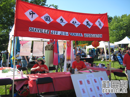 99老年协会布置的中国文化展角最引人注意。大红的横幅上书写着“中国文化展角,Oakville Jiu-Jiu Senior Association”,大红的宫灯,大红的桌布,就连工作人员也身穿协会会服–大红的T恤衫。中国文化展角,在一片苍翠中,一枝独秀,分外抢眼。展亭上悬挂着四张巨大的图片,分别是万里长城、秦始皇陵兵马俑、北京天坛和京剧剧照。这是中国传统文化的象征,也是中国的瑰宝和国粹。展台上摆放着会员们精心制作的折纸工艺作品,花篮、天鹅、花瓶……个个形象逼真,精美喜人。中国服饰和工艺品悬挂在展亭,十二生肖展板挺立在展台前,这些展品反映出中国人的勤劳智慧。