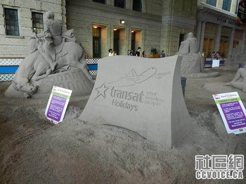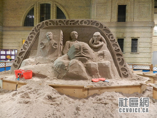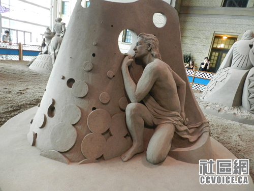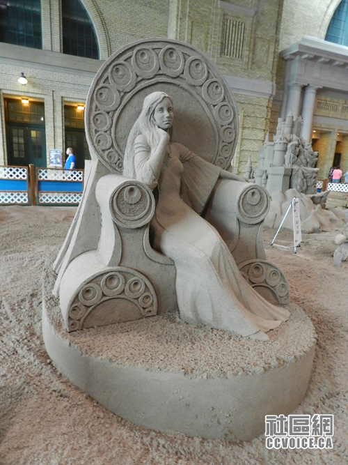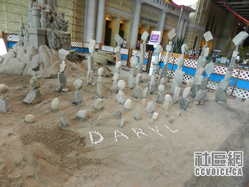 看完杂耍之后,我们继续前行,进入Direct Energy Centre大楼,迎面而来就是每年一度的获奖沙雕展。小孩觉得十分惊奇,不知道沙雕是如何炼成的。其实即使对于我这个大人来说,也觉得很是神奇,细细的沙子可以雕刻成如此栩栩如生的形象,形态之逼真,让人惊叹不已。另外,旁边的平衡石,有种巧夺天工之感,只是连连赞叹!