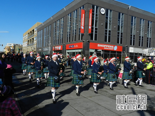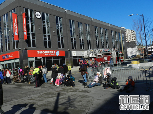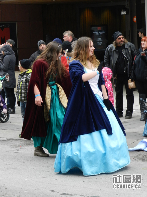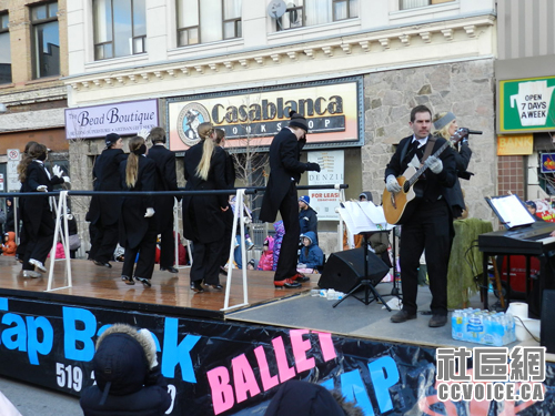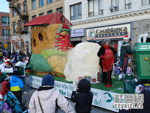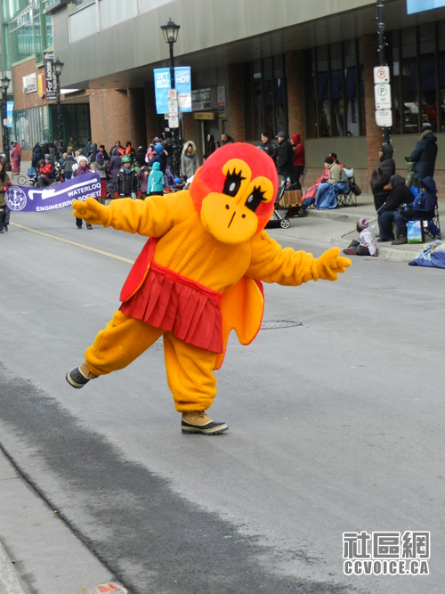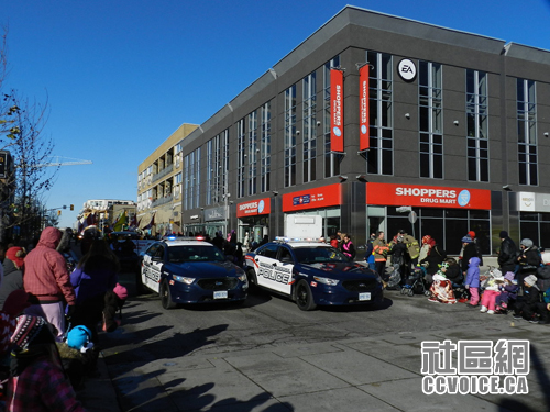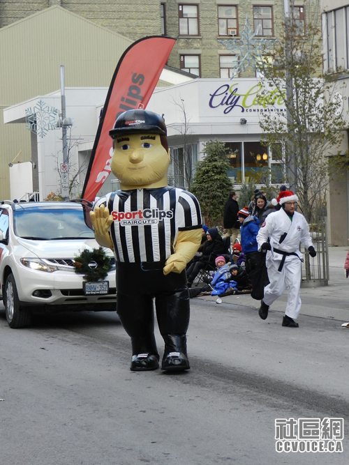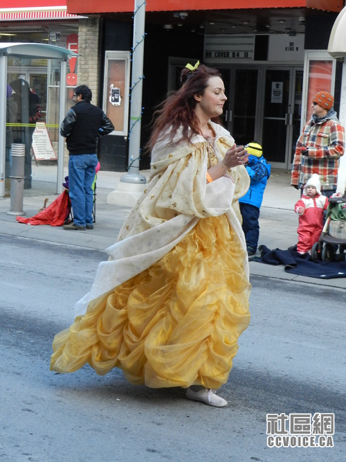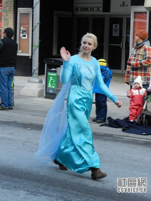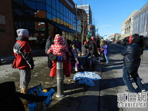 当天的寒冷可能让大家深深体验到。就拿记者本人来说,将帽子忘在车里,那份痛苦真的非常难受。记者差不多早上9:30就到了,当时蓝天白云,阳光灿烂,记者找到一个背风处,同时阳光能够照射到的地方。放眼望去,King街两旁都逐步汇集了游人。据报道当天的气温尽管只是零下3度,但加上风冷,让人感觉是零下8度。同时,人们可能还没有为冬天来临做好彻底的准备,所以,你看到商店角落都有人站着避风。跺跺脚,拍拍手,或者盖上毛毯,再捧上一杯热咖啡或巧克力,可能是大家的最舒服的选择。