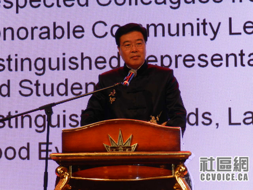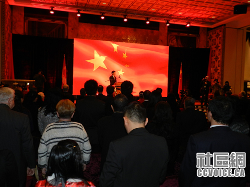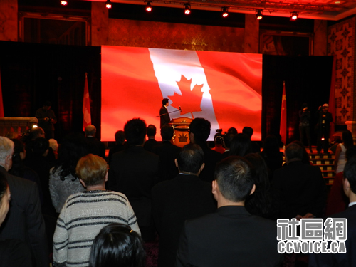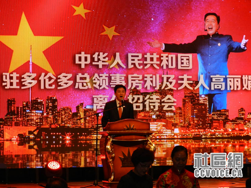 差不多预定时间,招待会宣布开始。副总领事张传兵担任活动主持,现场奏响起中华人民共和国国歌与加拿大国歌。在简单介绍当晚莅临的三级政要之后,当晚的主角,即将离任的房利总领事走上主席台,开始自己的离任感言。