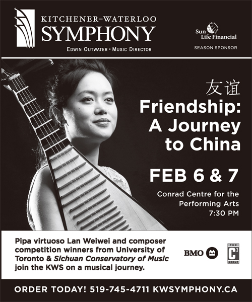 Kitchener-Waterloo Symphony(KW交响乐团)与来自中国的著名琵琶演奏家兰维薇,以及一批特别嘉宾一起通过乐曲,远航中国。富有中华传统文化的名为Friendship: A Journey to China音乐会将在中国羊年新年前夕,2月6日(周五)和7日(周六)晚7:30在位于36 King Street West的The Conrad Centre for the Performing Arts举行。
