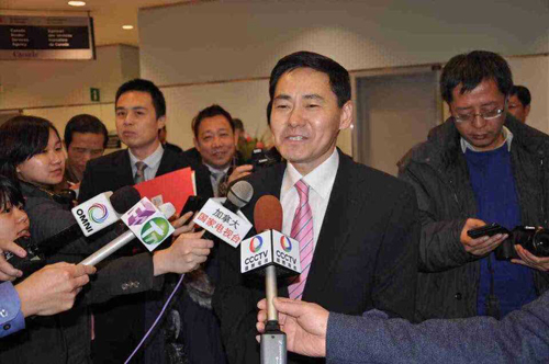 薛总领事在机场发表简短讲话,感谢多伦多侨胞和媒体代表不辞辛苦前来迎接。薛表示,当前,中加关系发展势头很好,面临着新的重要机遇。领区与国内相关地区的经贸、科技、人文等广泛领域的交流合作蓬勃开展。这些成就的取得,是长期以来中加两国政府和包括多伦多广大华侨华人以及媒体朋友们在内的各界人士共同努力的结果。