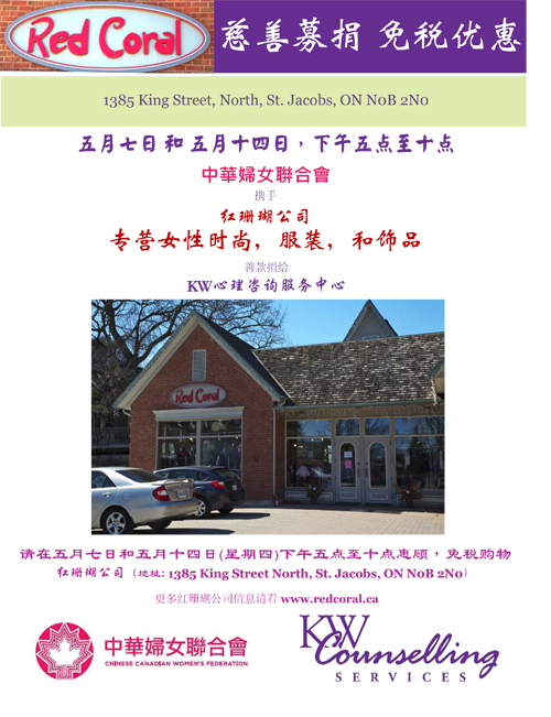中华妇女联合会携手红珊瑚公司(Red Coral),在5月7日和14日下午5点至10点举行慈善募捐,善款将捐给KW心理咨询服务中心。红珊瑚公司是专营女性时尚、服装和饰品。在慈善募捐时间惠顾,免税购物。