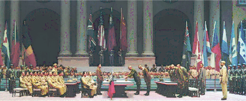 1945年5月,德、意法西斯走向覆灭,孤立无援的日本法西斯也日暮途穷。8月6日和9日美国分别在日本广岛、长崎投下原子弹;8日,苏联发表对日作战宣言。日方终于陷入四面楚歌的绝境,8月15日正午,日本天皇裕仁广播《停战诏书》,宣布接受《波茨坦公告》所规定的各项条件,无条件投降。1945年9月2日,日本政府代表在美国战舰“密苏里”号的甲板上签署无条件投降书。至此,第二次世界大战结束。