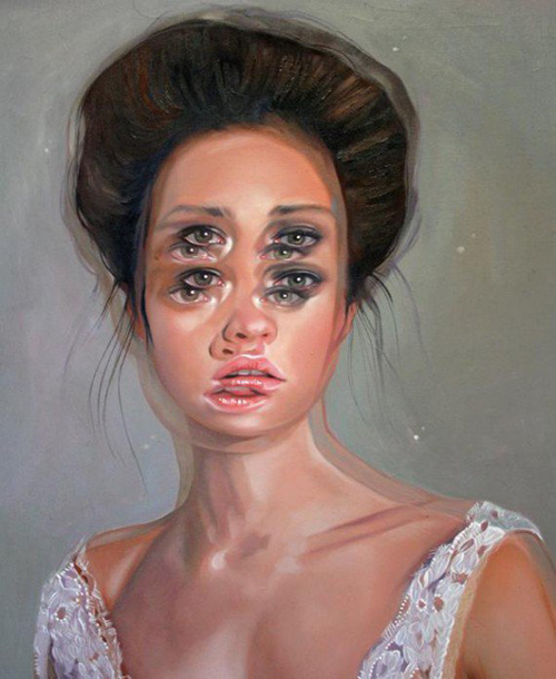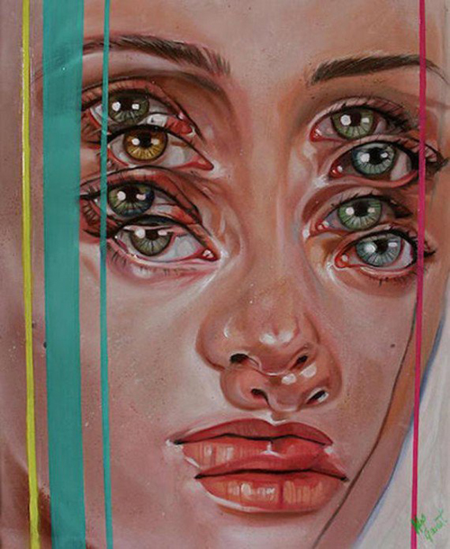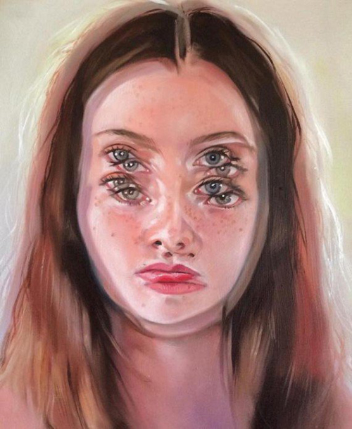 Alex:30岁那年我突发心脏病,出现了幻视,眼前的一切都有叠影,足足在病床上躺了一个月。当时我觉得自己就要死了。康复出院后,我辞掉空乘的工作,决定把时间和精力都花在画画上。从小我就喜欢画画,但一直只把它当成兴趣。突发心脏病和幻视,让我发现看待自己、看待世界的新角度,应该抓紧时间去做自己真正想做的事、过自己真正想过的生活。我画那些复眼的女孩,看上去模模糊糊、重重叠叠、无法聚焦,但即使如此,你也能感知到她们的美。我想说,生活也是这样。
