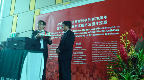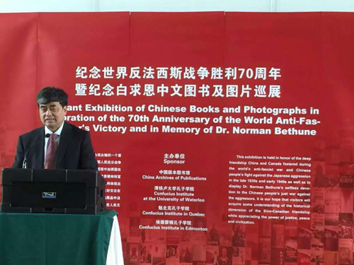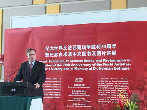 5月30日,纪念世界反法西斯战争胜利70周年暨纪念白求恩中文图书及图片巡展在滑铁卢大学Renison University College举行,本次活动由滑铁卢大学孔子学院举办。上午10点半,官方开幕仪式举行,滑铁卢华人爱乐乐团友情演唱,Renison Unviersity College董事局主席Peter Ringrose致欢迎词。现场嘉宾包括有中国国家新闻出版广电总局副局长吴尚之、Kitchener-Waterloo国会议员Peter Braid、中国驻多伦多领事馆总领事薛冰、滑铁卢代任市长(Acting Mayor)Angela Vieth和Kichener市长Berry Vrbanovic等。吴尚之副局长现场举行了简单的捐书仪式。