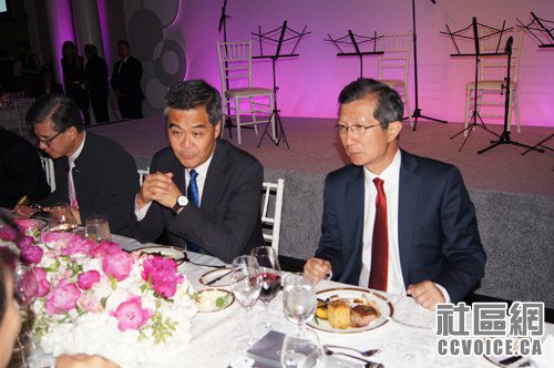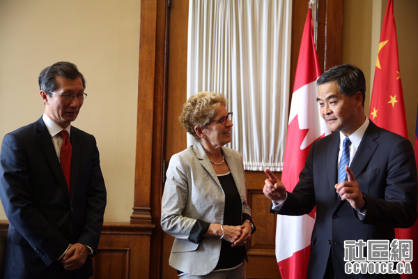 特首梁振英还在省议会大楼与安大略省长韦恩会面,有何秘可宣?陈国治说,省长和特首会谈涉及经济、民生、经贸合作到基础建设等多方内容。言谈中,特首介绍说香港地铁效率相当之高,达到99.9%。陈国治也认为,省长与特首的会谈效率也相当之高,短短30分钟,双方分享彼此的经验和心得,包括两地均面临的教育、地铁修建、居民住房、应对人口老化等问题,及国际贸易的“一带一路”等。晚间,陈国治还出席了“香港晚宴”,与特首、多伦多市长庄德利一起担任主礼嘉宾。