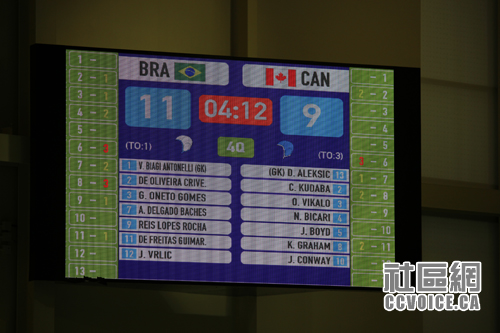 可是从整个比赛来看,男子水球队确实要比女子水球队玩得过瘾,好看。但是从技术水平来看,加拿大队好像没有什么优势,从四局得分可以看出,即2:4、4:3、1:4和2:0,最后结果就成为9:11。巴西队的优势在两个方面,第一投球速度快而准;第二守门员很强,罩得住。当然,可能还有一点,巴西队要野蛮些,而加拿大队相对要文明些。总而言之,这次预赛,加拿大男子队输了,输得比较惨。