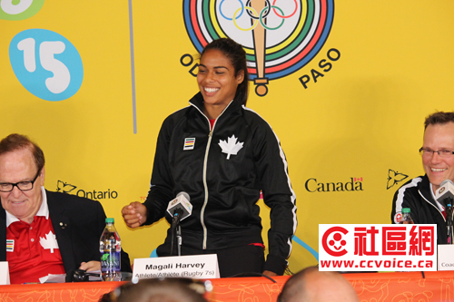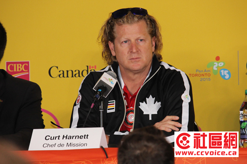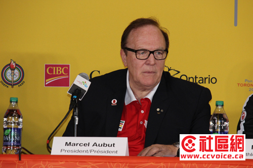 7月10日,也就是2015多伦多泛美运动会开幕式举办前的几个小时,加奥委会(Canadaian Olympic Committee)在泛美运动会媒体中心举办新闻发布会。加奥委会主席(President)Marcel Aubut,2015多伦多泛美运动会加拿大队Chef de Mission Curt Harnett,运动员代表Rugby选手Magali Harvey和教练代表Craig Taylor出席了新闻发布会。本次新闻发布会由奥委会新闻总负责人(Press Chief) Carl Vallee举行。