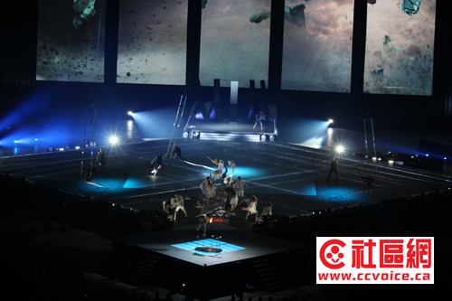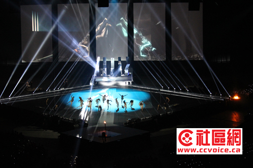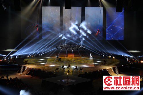 入场仪式之后,接下来的节目是The Birth of the Two Fires,也就是舞台两侧在一个武士的动作中,冒出熊熊大火。接下来就是Forest Borealis,一批人在跳舞,同时出现几个透明的球,人在里面舞动。之后,就是Fireline,这个比较好理解,主舞台上正中间出现一条界线。这是这个界线是有熊熊大火隔开的。两边有一拨人在舞蹈。当然也有人飞跃这个“火线”。