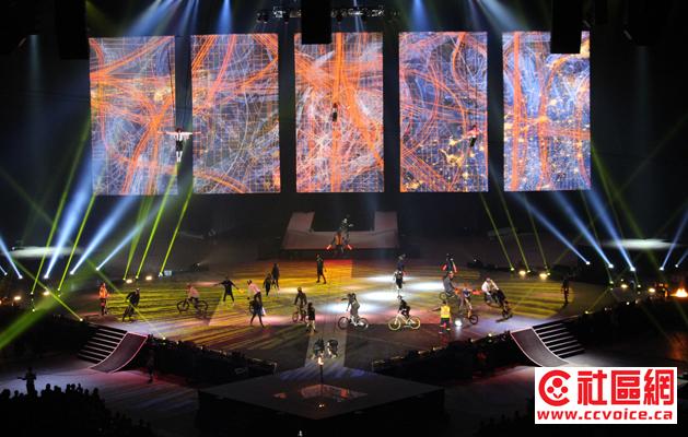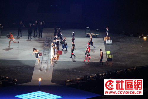 下一幕就是波段(Waves),先是舞台左右有四个一组的人,手里拿着类似天线锅的透明雨伞,而印象中的音乐随着他们的调整在变动,有点类似调频的感觉。而舞台上,也有人表演,最后所有人都回到舞台,搭建了一个高塔。接下来的一幕是Hearts in Bloom,场面很宏大,而A Storm of Possibilities给人的感觉是电闪雷鸣,A Train of Life比较出乎意外,说的是一拨人告别亲人,坐着火车远处。至于Trailblazing,估计那些爱好自行车运动的过了一把瘾。后面的节目,等待下一部分再简单介绍吧!