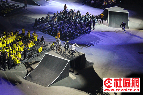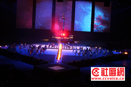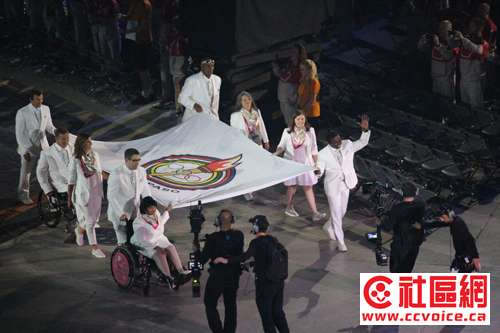下面当然在RCMP的护送下,加拿大国旗入场,魁北克艺术家Chilly Gonzales演奏了自己的曲子TRain of Thought,之后升旗仪式进行,Veronic DiCaire唱国歌,Peter Oundjian指挥多伦多交响乐团,大屏幕国旗闪耀。之后就是各国运动员入场,总共有41个国家的运动员以字母顺序入场,但东道主加拿大是最后一个入场。