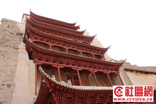 九层楼,也就是洞窟编号第96号,初唐(618-705)。 此窟开凿于初唐,窟内的大佛高35.5米,两膝间宽度为12米,是莫高窟的第一大佛。根据敦煌遗书《莫高窟记》记载,这尊大佛为唐代武周证圣元年(695年)由禅师灵隐和居士阴祖所建。是佛国三世中的“未来佛”弥勒佛,即释迦牟尼的“接班人”。大佛的制作方法为石胎泥塑,即在崖壁的石沙岩体上凿出佛像的大体形状,再用草泥垒塑、用麻泥细塑,最后着色而成。这尊大佛因多次重修,已非唐塑原貌,但仍不失雄伟壮观的气势。窟前的建筑为九层楼,因其共有九层而得名,原为四层,晚唐(874-879)年间建成五层,宋初(966年)重修,九层楼是1935年建造,它攒尖高耸,檐牙错落,铁马叮咚,已成为莫高窟的标志之一。