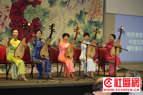 第一个节目是小组唱“中加友谊万年长”,当身穿旗袍的五位美女携乐器亮相时,现场观众被她们的优雅与庄重所震撼。该曲式根据“姑苏好风光”改编,由上海评弹团团长秦建国填词,用以表达中加两国人民相互祝愿,共同富强,友谊地久天长的愿景。
