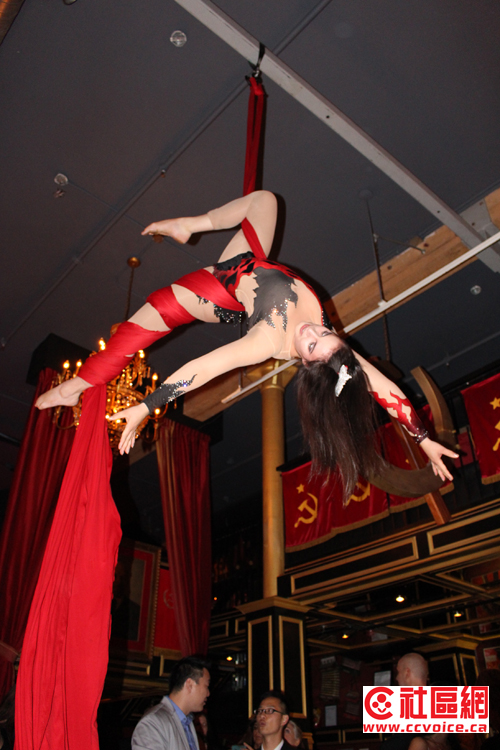 第三,舞者的红,与影星所期望的红地毯不是相映成辉吗?在寸土寸金的多伦多市中心,酒吧的空间一般都有些狭窄,更增添酒吧的浓郁气氛。然而就是在如此拥挤的环境中,舞者,借助悬挂于顶梁的大红绸带,来一段空中热舞。此情,此景,不让人尖叫才怪呢?这可能也是设计者想要达到的目的吧!