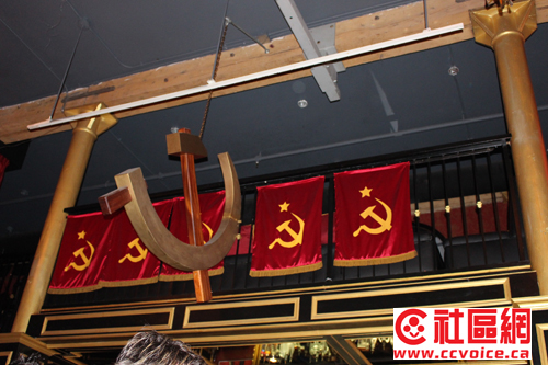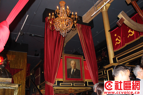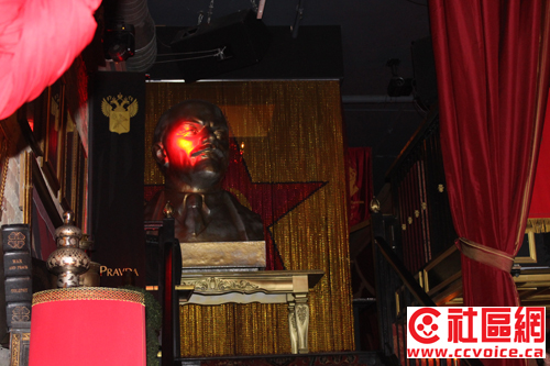 第一,酒会的时间安排在晚上9:30,地点在很有特色的酒吧里!记者试图回忆,但好像找不出哪一次受邀活动是在晚上9:30开始的。至于酒吧的特色,读者可以从几张图片上略见一斑,正如来自北京的“独闪”公司总裁佟蔓薇小姐在微信上所描述:Pravda Vodka Bar,俄罗斯主题酒吧,热烈的红、奔放的舞者、超有感染力的美……