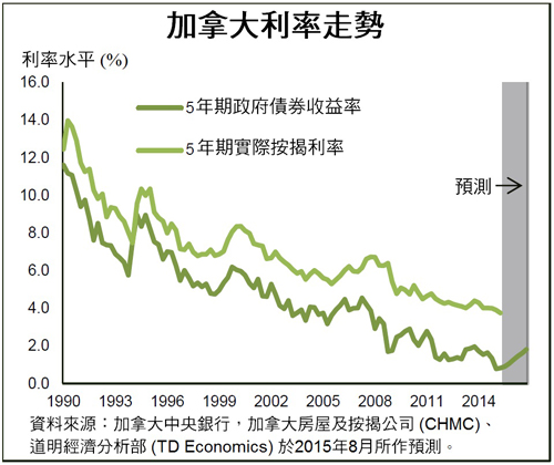 钟頴辉续称:“倘若债券收益率於2016年和打后的时间上升,以致按揭利率相应上调,房价高昂的多伦多和温哥华可能是最易受影响的市场。然而,安省和卑诗省的经济情况较为良好,楼市活动大概不会出现剧烈调整。”2015年的平均房价增长估计约为8%至10%,明年的增长势将减慢至3%至5%。就这个幅度来看,价格被高估的程度(估计有约10%至15%)可能会维持下去,导致这些市场在利率或失业率遭受无法预料的冲击时,难以抵御这些冲击的不良影响。