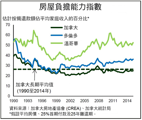 安省和卑诗省内多个主要房屋市场,因为待售房屋的数量相对稳定,加上最近需求大增,处於对卖家有利的局面,超过60的房屋销量与新掛牌比率证明了这一点。 目前安省和卑诗省的楼市活跃程度,继续维持至2016年的可能性不大。大体而言,目前房价的增长速度比收入增长高出一倍多,削弱房屋负担能力,特别是在多伦多和温哥华。