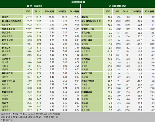 总括而言,整个加拿大楼市受惠於低利率,2015年似乎又是创纪录的一年。今年推动整体楼市造好的力量大多源自安省和卑诗省内的主要市场。可是,随着今年余下日子逐一逝去,在依赖商品的经济体之外的大多数市场有望转强,但增长步伐将受到抑制,原因是到了今年稍后,低利率对房屋需求的良好影响将减弱。全国的平均成屋价格可能会於今年上升逾7%,然后於明年冷却至仅1 %。今年的房屋动工量可能是平均每月约19万个单位,明年将回落至每月16.5万至17万个单位,这是较能持续的步伐。