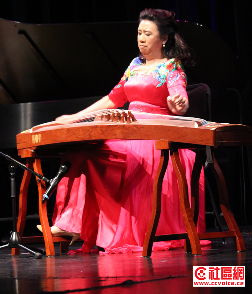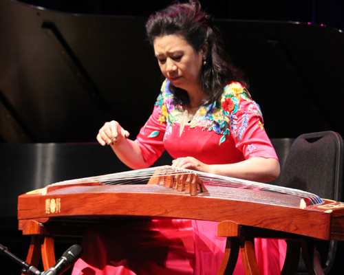 远道从中国而来的周望教授,也是范老师的学生,目前已是中国音乐学院教授,硕士研究生导师,中国音乐家协会中国古筝学会副会长,中国民族管弦乐学会古筝专业委员会副会长,陕西筝派重要代表人物。音乐会上半场周望教授演绎了“秦桑曲”和“西部主题畅想曲”。前曲改编自唐朝诗人李白的《春思》,以流行的陕西关中的“碗碗腔”音乐为素材,取“秦桑”二字为题,描述妙龄女子四年远方亲人的情景。“西部主题畅想曲”富有典型、浓郁的中国西部风格特征,通过风格多变的舞蹈变化和酣畅淋漓的主题抒发,既表现柔婉细腻的西域风情,也刻画粗犷豪放的西部地域风貌。