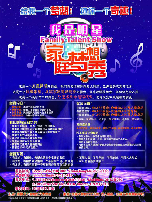 参赛家庭可选择多种报名方式:1)现场报名:可在活动宣传点领取报名表现场报名,或至下列2处地址报名:168 Konrad Crescent Unit 4, Markham;385 Silver Star Blvd, Suite 318, Scarborough;2)微信(Cocosu1314或 DD12902389)报名;3)官方网站(www.iamstar.ca)报名。报名费为:海选和月赛报名费:$20/人;半决赛和决赛报名费:$50/人。本次活动的咨询及报名热线:416-710-3081,647-975-9136,网站www.iamstar.ca