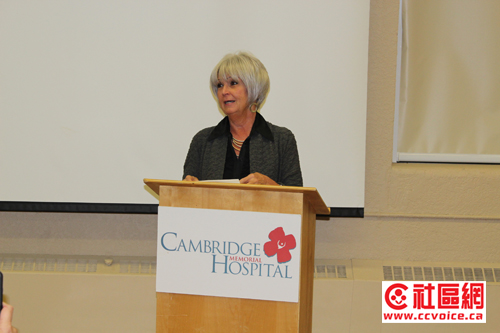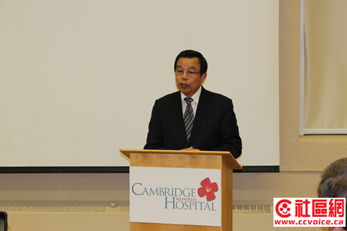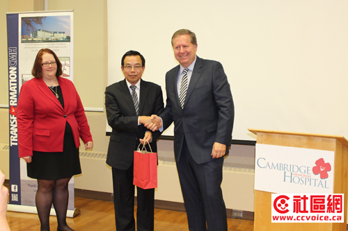 捐款儀式由醫院基金會執行董事(Executive Director) Jennifer White主持。在簡單介紹之後,Jennifer邀請基金會董事局主席Michael Takacs上台,代表基金會向吳榮泉處長贈送禮品。之後,滑鐵盧地區議員主席Ken Seiling和Kitchener市議員Paul Singh上台致辭,贊賞本地台灣社團對社區的支持與奉獻。