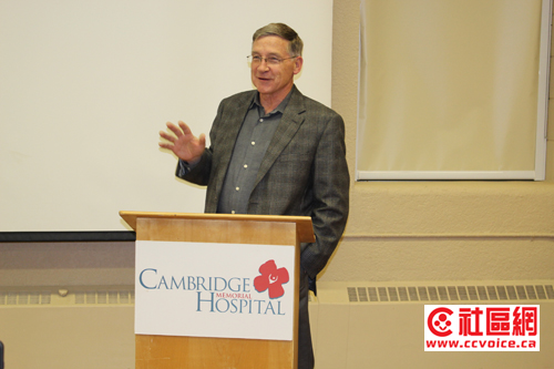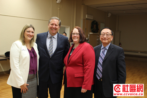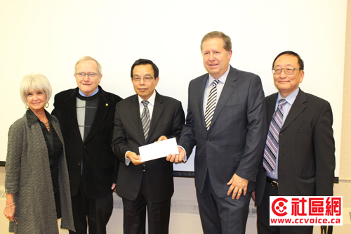 由于Renison University College校長Wendy Fletcher正在中國和日本訪問,未能親臨現場,特別代表Caroline Tanswell在發言中表示,該校通過語言與文化教育來強化國際參與,並熱情展望與本地台灣社區有更深入的合作,更強大地支持劍橋紀念醫院基金會。在轉呈支票之前,吳榮泉處長介紹了加拿大與台灣在經濟、貿易與文化方面的合作情況,特別指出台灣大學與滑鐵盧大學之間的交流,盛贊本地台胞支持與參與社區事務。最後,吳榮泉處長邀請基金會董事局主席Michael Takacs、Andrew吳、Caroline Tanswell以及Wilfrid Laurier大學前任校長Robert Rosehart上台,見證愛心傳遞。