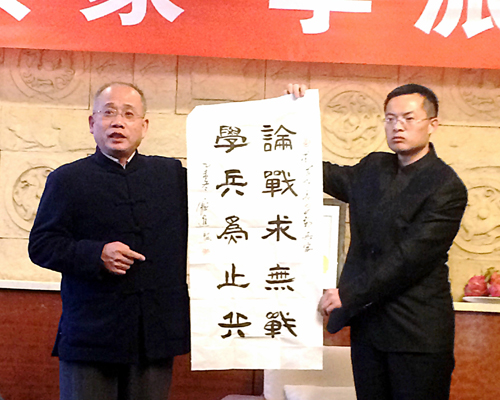 新兵家学派拜师仪式日前在西安皇后大酒店举行。著名龙凤文化研究专家、龙凤国际联合会主席、西安中华龙凤文化研究院院长、陕西省孔子学会副会长兼秘书长庞进,与刘兆英、孙见喜、张天德、王光易、向建军等学者应邀出席见证。庞进向兵学专家、新兵家学派掌门人、西安理工大学军事教员刘军成赠送了题写的“论战求无战,学兵为止兵”条幅,并就此主题即席讲话。