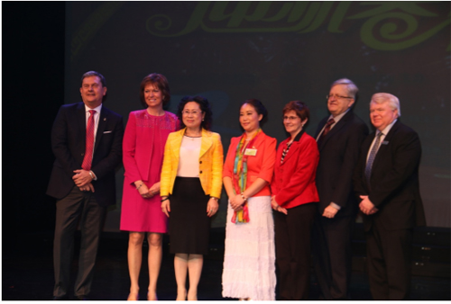 晚会聚集了来自Oakville、Mississauga、Milton、Toronto等地近600名热情观众,也得到了政府和中国总领馆的大力支持。联邦参议员胡子修先生、中华人民共和国多伦多总领事薛冰发来了贺信。当晚出席的政府代表有国会议员Pam Damoff女士、Oakville市长Rob Burton先生、国会议员John Oliver先生等;瑞邦资产管理公司总裁廖子蔚女士和瑞邦金融集团董事长李洪先生也到场向Oakville的华人恭贺新春,并为Oakville新医院现场捐款$1,000,用于新医院配套设施的修建。Oakville医院基金会主席Tina Triano女士当场为廖子蔚总裁颁发了表彰证书。瑞邦金融集团和廖子蔚总裁的善举受到嘉宾和观众的高度赞许,大家报以长久而热烈的掌声。