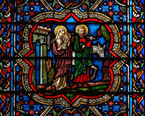 有多幅画作描述,约瑟赶着毛驴,毛驴上坐着怀抱圣婴的玛利亚,深夜逃往埃及。而希律王没有得到东方博士后来给他报信,不知哪个婴儿是耶稣,就在伯利恒以及周围四境区域内,把所有2岁以下的男婴全部杀光。