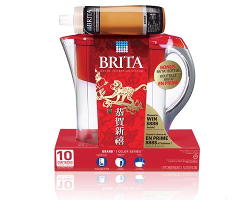 Brita能带给您随时饮用纯净水的便利。新春佳节,特推出猴年限量版滤水壶超值套装,除一个红色滤水壶外,还包含一只Brita轻便软式随身滤水壶。Brita滤水壶套装保证您和全家一整年都能饮用到令人安心的水,还有机会获得猴年大奖价值$888的Visa信用卡。每一个猴年滤水壶套装中都有一个红包,只需打开包装,查看红包内容即可获知是否中奖。请浏览www.brita.ca/cny了解详情。