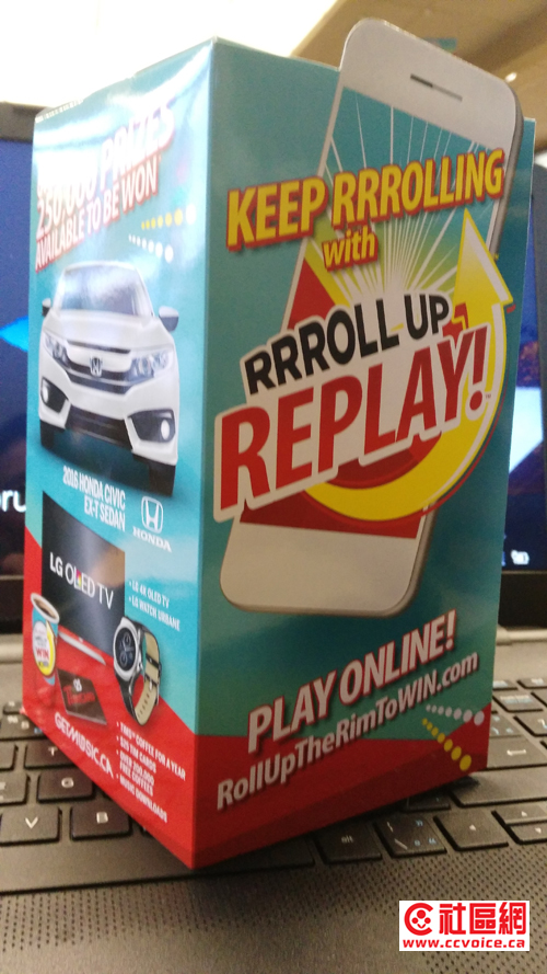 这几天小编没有去Tim Hortons,世界变化还真快。这不,每年一度的Tim Hortons卷杯抽奖(Roll Up the Rim)活动又开始了。这是小编坐在这家高速401旁边的Tim Hortons才发现的。这是小编最爱来的地方,因为这家店有许多电源插口,小编一般可以呆上三个小时没有问题。假若您想知道这个地方,就与小编联系吧!