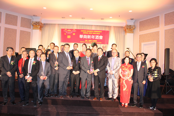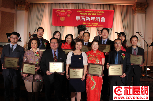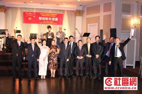 在会长马舟良和理事长李倩的带领下,商会理事会成员上台合影留念。主办方还特意邀请当晚到场的兄弟商会负责人一齐上台,用方言向来宾祝贺新年。对于当天活动赞助商,包括钻石赞助Sun Life Financial,黄金赞助Canada International Condos Marketing Inc及众多白银赞助商,包括有COSTCO,许群和一德地产等,主办方特意颁发奖牌,以表谢意。