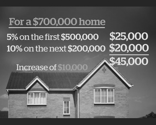 比如,你买一栋70万的房子,50万以下的部分,需缴纳5%首付,也就是$25,000,而从50万到70万,你需要缴纳10%,也就是$20,000。总共的首付应为4万5千,比目前的政策多缴纳1万。目前政策是,100万以下的房子,买主只需要支付5%的首付。超过100万的房子,法律规定的首付为20%。