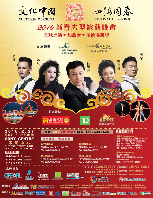 2月27日晚,SONY CENTRE将上演大家期盼已久的一场精彩演出,“文化中国·四海同春”慰侨综艺晚会将在多伦多为此次2016年新春全球巡演划上圆满的句号!