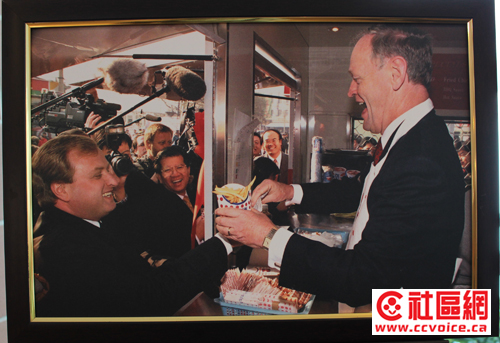 1998年11月20日加拿大哥伦堡美食食品有限公司在北京开业,加总理克雷迪尔为该公司开业剪彩,并系上围裙在位于东直门的安妮诗分店当起了“服务员”