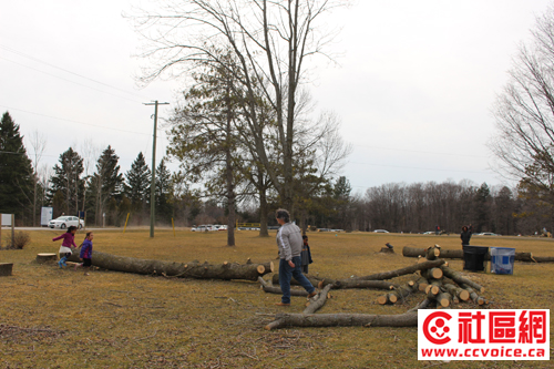 在品尝完枫糖之后,小孩子们爱上跨木头。今年服务区将大草坪上的十多棵老树砍到,去掉小枝头之后,主干和大枝头就锯成一段一段,估计是在游客们的帮助上,摆放成各种形状,小孩子们就喜欢沿着木头一遍又一遍地行走。当然,靠近商店附近,由秸秆所搭成的迷阵也非常吸引小孩,大家乐此不彼。