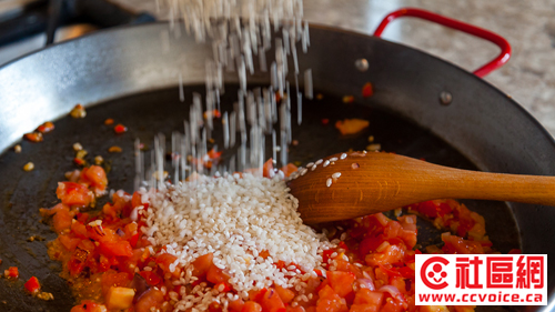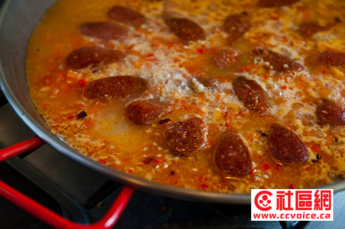 锅中放入橄榄油,加入洋葱丁、蒜蓉、欧芹、番茄、甜椒丁炒香,加入米炒拌均匀,加白葡萄酒和泡好的番红花水,用海盐和黑胡椒调好味,稍微收汁加入烟熏辣椒粉,加高汤,摆入香肠海鲜,开中火,煮至汤汁收干,米和海鲜熟即可关火,期间绝不可搅动,隻需不时转动大锅,据说西人爱吃带锅巴的夹生饭,我更喜欢番红花染上金黄色的生米煮成熟饭的感觉。