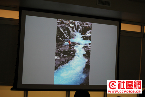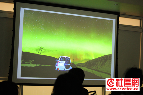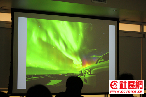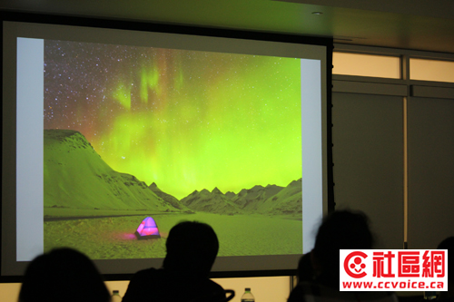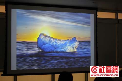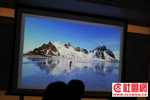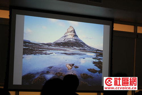 下半部分有两个讲座,第一讲由图腾摄影负责人Michael介绍他在今年2月底至3月初的冰岛行,即“一个摄影师眼中的冰岛”。Michael用大量的照片介绍这次冬季的冰岛之旅。尽管大部分时间啃的是面包或方便面,但大家玩的兴致很高,当然也相当幸运。由于是冬季,他们主要呆在冰岛南部,不仅成功拍摄了摄影师不会错过的经典景色,而且有幸三遇极光,并且一次比一次规模大。记者相信,在这100余位听众中将会组建下一次冰岛之旅。