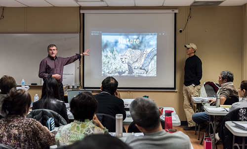 在连续两天20多小时的敎学中,著名野生动物摄影师杰夫为学员们同声翻译,针对自然类摄影,野生动物摄影,人像摄影,新闻摄影,纪实摄影,抽象摄影,以及创造性与非现实摄影几大门类,传授摄影比赛的基本原则,作品特点与欣赏,评估方式,打分技法等相关知识,并进行实战评片训练。学员们反应积极热烈,实战裁判课程笑声互动不断,最后要延时一个半小时。