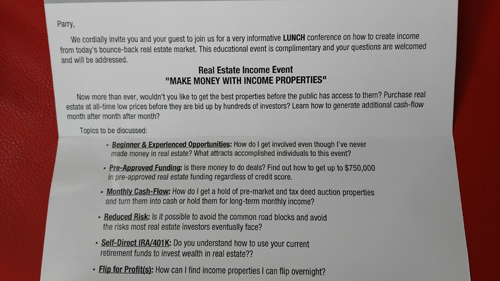 也许,读者会问,你参加吗?我的回答是否定的,因为很多很多年以前,笔者就参加过类似的活动,不能说没有收获,但笔者好像不适合走这条路。也就是说,这些邀请本身,尽管有些老套,价值确实不菲。假若您有野心,致富之心强烈,大可以参与,绝对有收获。