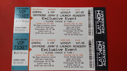 第二份邀请与第一份有些类似,但来自Daymond John’s Launch Academy。说实在话,至于谁是Daymond John,笔者毫无知晓,但是邀请函内容还真是很吸引人,并附有两张VIP票,价值$147。更为吸引人的是,还有一大堆礼品等您拿。
