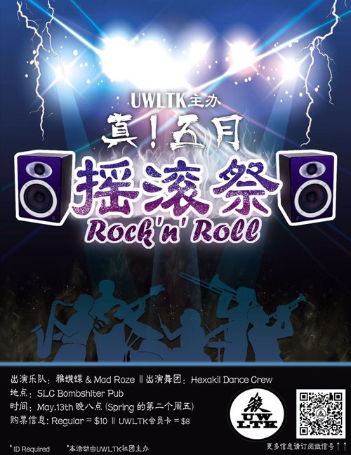 由UWLTK社团主办的Rock ‘n’ Roll 5月13日晚上在SLC Bombshelter Pub成功举办,出演乐队有雅蠛蝶和MadRoze(妈的弱智),舞蹈由Hexakill Dance Crew担任,工作人员、舞团和乐手近30人。超过150人参与,部分人只能站着观看,现场之火爆,年轻人的那份激情,超乎大家的想象。活动以Hexakill开场舞开始,包括有Say My Name和Red,而中场休息时,Hexakill再次登台,演绎Wiggle Wiggle和Someone like U。MadRoze乐队歌曲包括Don’t Gry,Nemo,Paradise City,Re:make,She’s Gone,Shoot To Thrill,Smells Like Teen Spirit,Sweet Child O Mine和中文歌曲“杀死那个石家庄人”。而雅蠛蝶演奏Butterfly,“那些年”, Endless Rain和“海阔天空”。整个演出持续两个半小时。